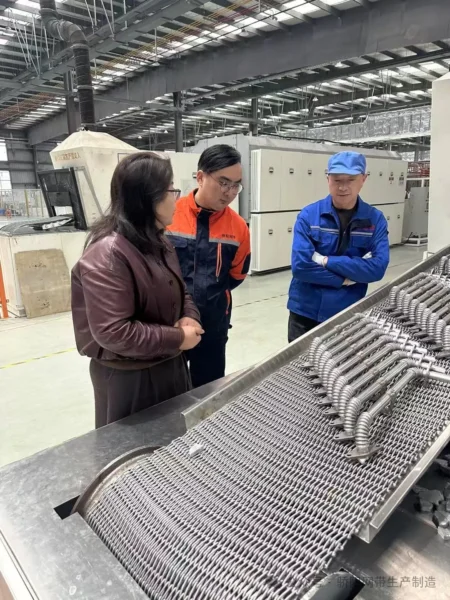 In recent years, the automotive industry, especially the new energy vehicle sector, has been booming. Today, Jiaoyang Mesh Belt was invited to the Yancheng branch of Meilianqiao Technology Group to provide after-sales repair services for their brazing furnace mesh belt. According to customer feedback, a wire on the high-temperature mesh belt had broken, accompanied by belt elongation issues. Let’s follow Jiaoyang to the site to investigate!